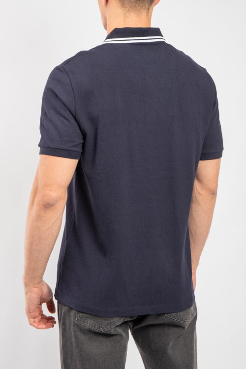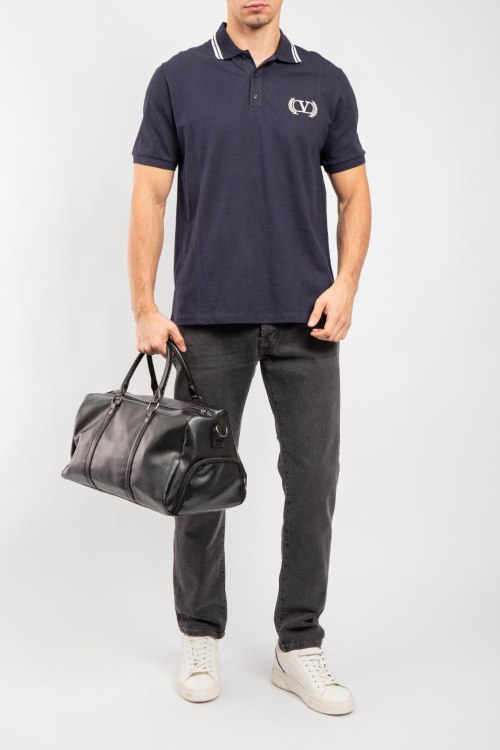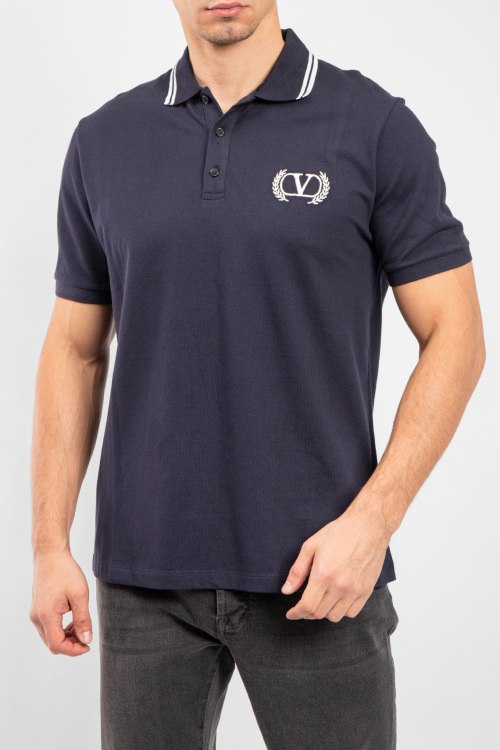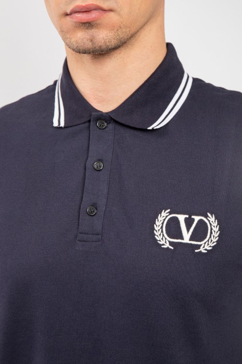 Мужская темно-синяя хлопковая футболка-поло от Valentino (Валентино). Логотип на груди, отложной воротник, застежка на три пуговицы, короткий рукав, классическая длина.