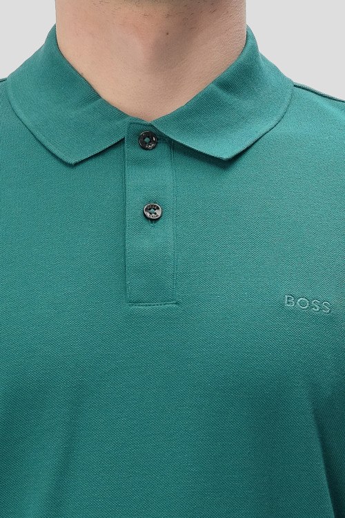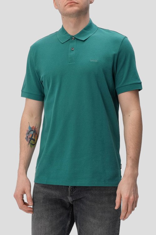 Детали: Мужская зеленая хлопковая футболка-поло Pallas от Hugo Boss (Хуго Босс). Логотип на груди, отложной воротник, застежка на две пуговицы, короткий рукав, классическая длина