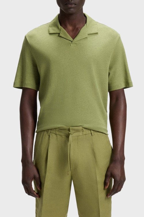 Детали: Мужская оливковая футболка-поло из хлопка и льна H-Ponti от Hugo Boss (Хуго Босс). Отложной воротник, V-образный вырез, короткий рукав, классическая длина
