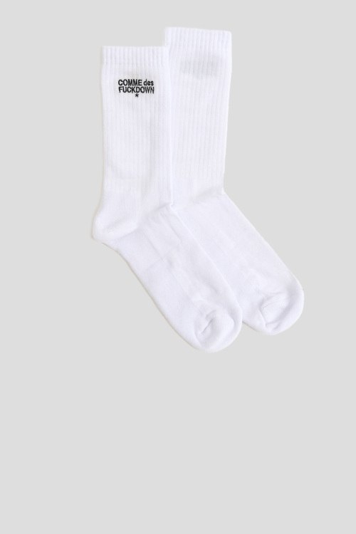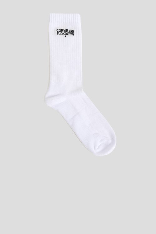 Детали: Мужские белые носки из хлопкового микса от Comme des Fuckdown (Камм дес Факдаун). Высокая модель, эластичная резинка на манжетах, принт с логотипом бренда