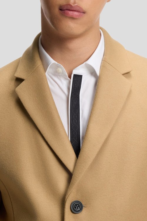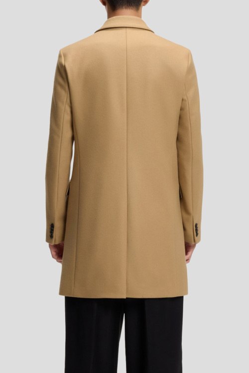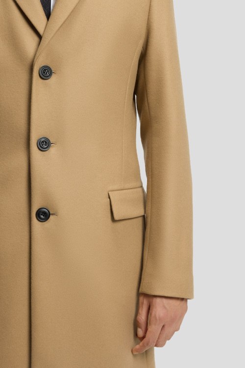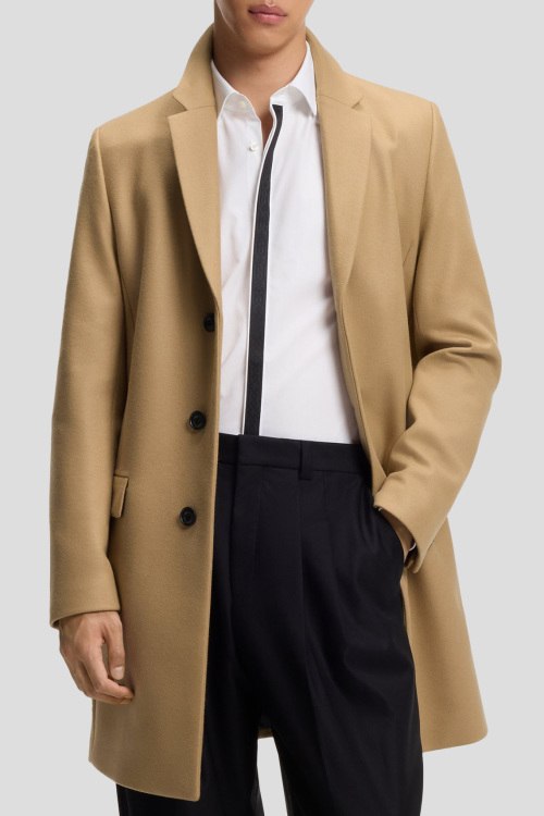 Детали: Мужское бежевое пальто из шерсти и кашемира Migor от Hugo by Hugo Boss (Хуго бай Хуго Босс). Однобортный фасон, отложной воротник, два кармана с клапаном, застежка на три пуговицы, длина выше колен