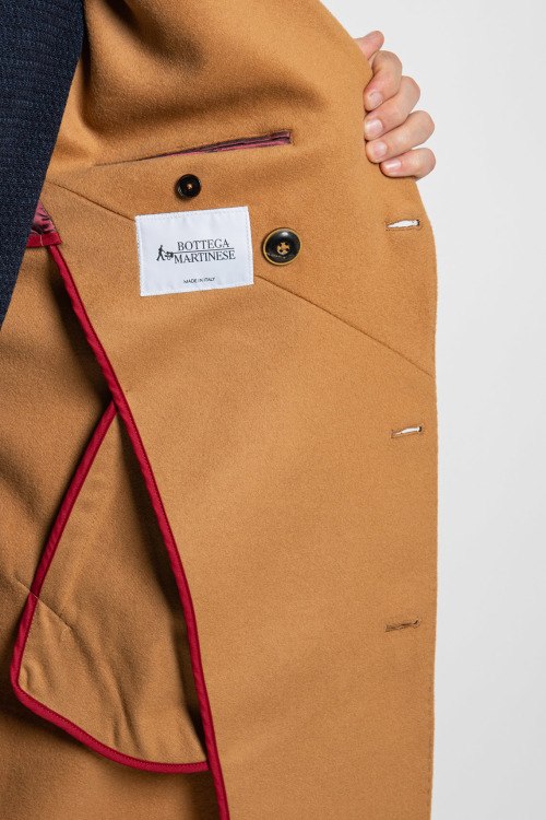 Мужское коричневое пальто из шерсти от Bottega Martinese (Боттега Мартинес). Длина до колен, двубортная модель, отложной воротник, застегивается на пуговицы, по бокам карманы, дополнительный внутренний прорезной карман, нашивка с логотипом бренда