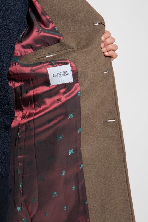 Мужское светло-коричневое пальто из шерсти от Bottega Martinese (Боттега Мартинес). Длина до колен, отложной воротник, застегивается на пуговицы, по бокам карманы, дополнительный внутренний прорезной карман, нашивка с логотипом бренда