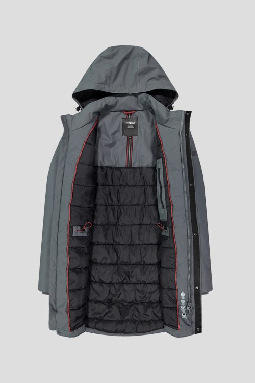 Детали: Мужская серая парка из полиэстера от CMP (СМП). Удлиненная модель, застежка на молнию и кнопки, вшитый капюшон, прорезные карманы, подкладка Feel Warm Flat обеспечивает тепло и свободу движений благодаря уменьшенной толщине, а система Clima Protect с водонепроницаемой и дышащей мембраной эффективно защищает от ветра и дождя, сохраняя сухость.