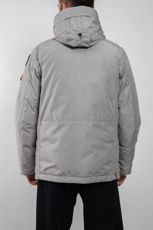 Детали: Мужская серая парка из полиамида от Parajumpers (Параджамперс). Застежка на молнию и кнопки, вшитый капюшон, четыре внешних кармана, два внутренних, нашивка на рукаве. модель утепленная миксом из пуха и пера