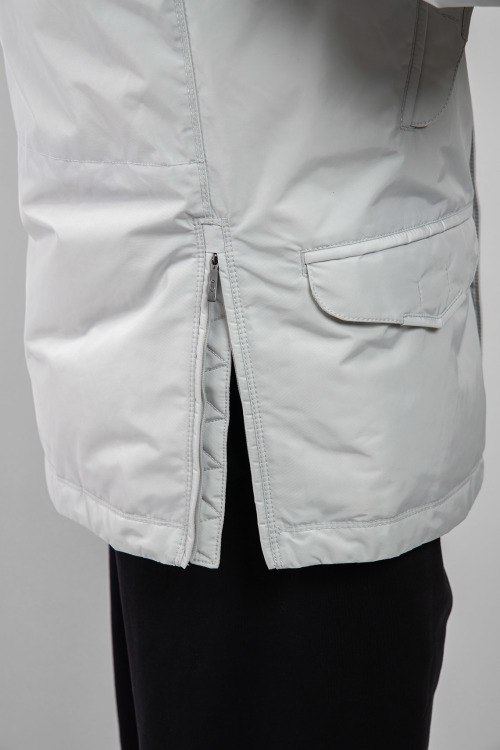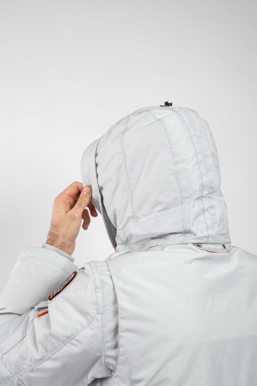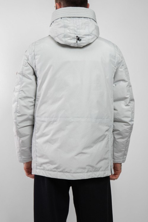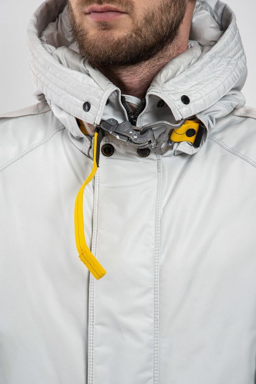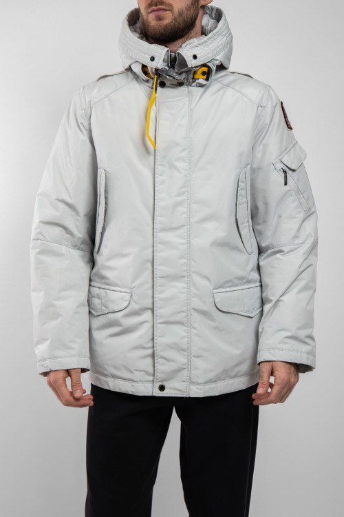 Мужская светло-серая парка из полиэстера от Parajumpers (Параджамперс). Застежка на молнию и кнопки, высокий воротник-стойка, съемный капюшон, внешние и внутренние карманы, по бокам молнии, патч-лого, модель на синтепоне.