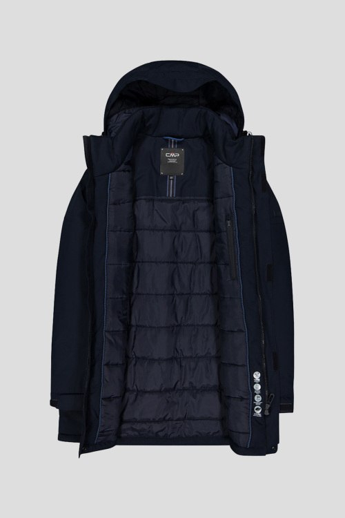 Детали: Мужская темно-синяя парка из полиэстера от CMP (СМП). Застежка на молнию и кнопки, воротник-стойка, вшитый капюшон, трикотажная резинка на манжетах, модель разработанная для защиты, комфорта и стиля зимой, отличается технологичной конструкцией, которая отлично подходит для холода, ветра и сырости. Тонкая и эффективная подкладка Feel Warm Flat обеспечивает отличную теплоизоляцию при минимальном объеме, гарантируя тепло и свободу движений даже в самые суровые дни.
