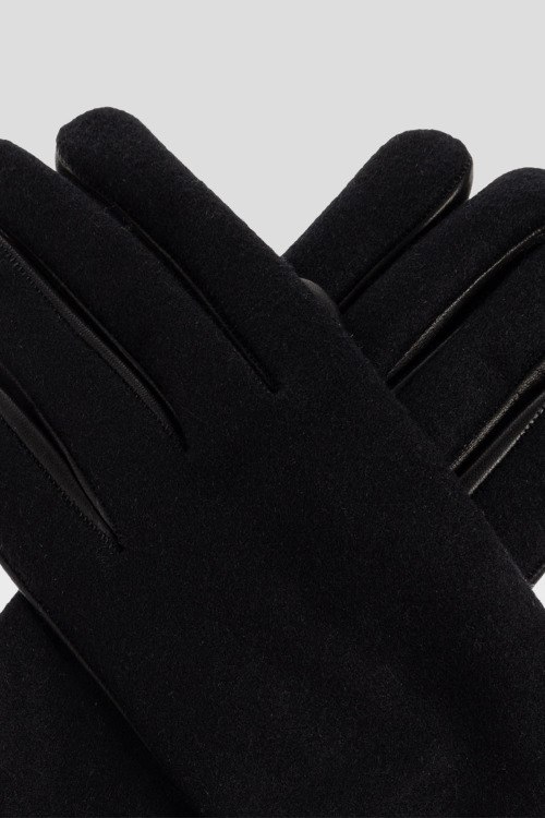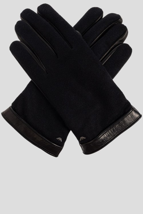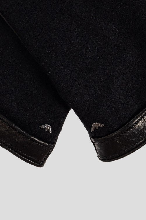 Детали: Мужские черные перчатки из шерсти и кожи от Emporio Armani (Эмпорио Армани). Комбинация материалов, значок логотипа, резинка на запястье