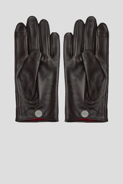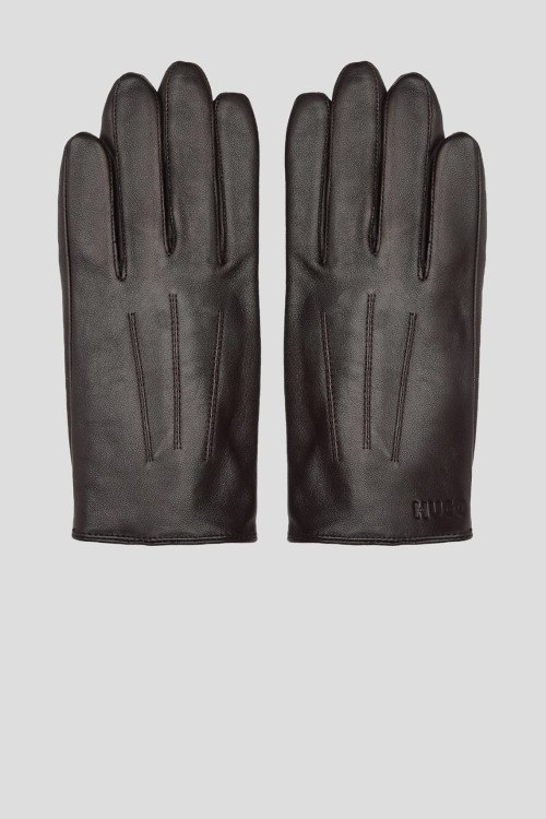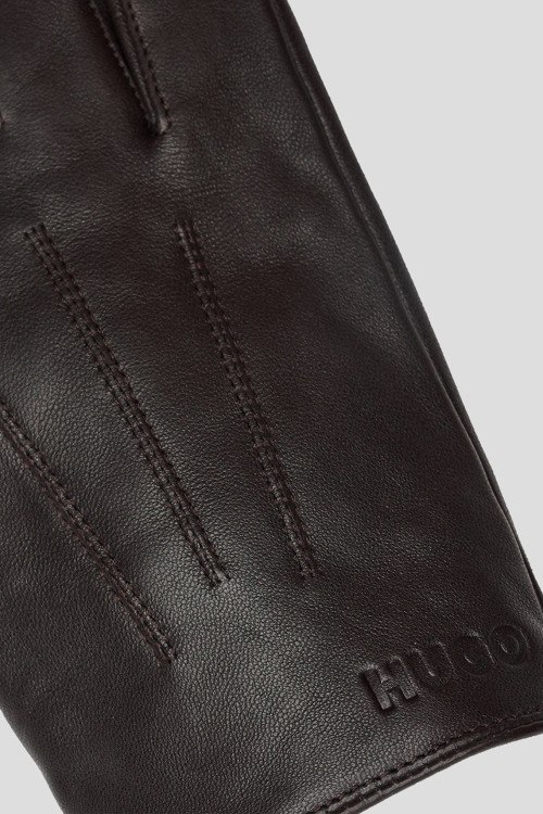 Детали: Мужские темно-коричневые кожаные перчатки Jaan от Hugo by Hugo Boss (Хуго бай Хуго Босс). Модель из гладкой кожи, тиснение логотипа, тональная строчка