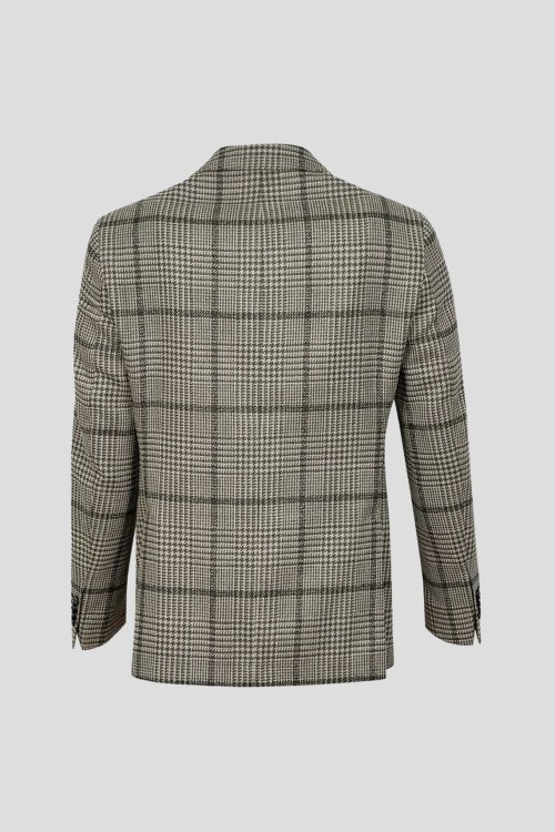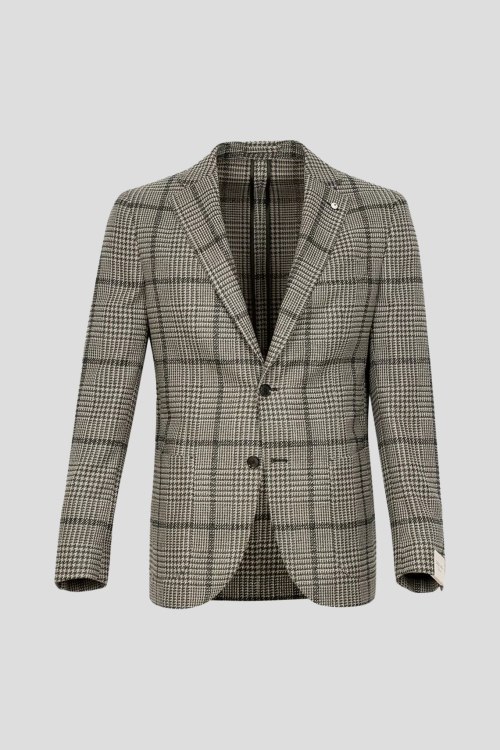 Детали: Мужской бежевый пиджак из шерстяного микса от L.B.M.1911 (Л.Б.М.1911). Дизайн в клетку, отложной воротник, застежка на пуговицы, длинные рукава, модель без подкладки, накладные карманы