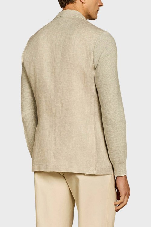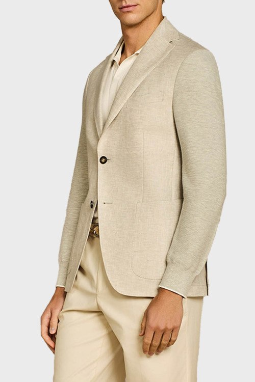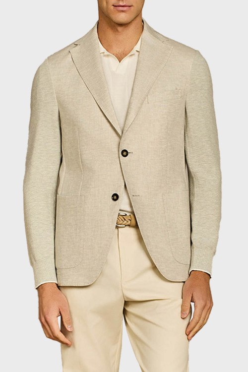 Детали: Мужской бежевый пиджак из льна и хлопка от Paul Taylor (Пол Тейлор). Отложной воротник, застежка на пуговицы, длинные рукава, накладные карманы