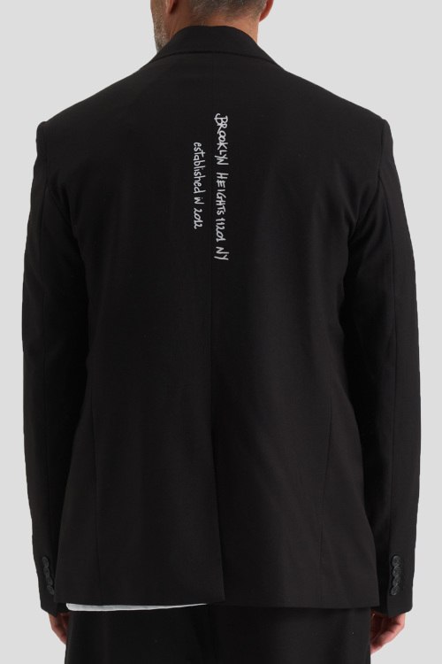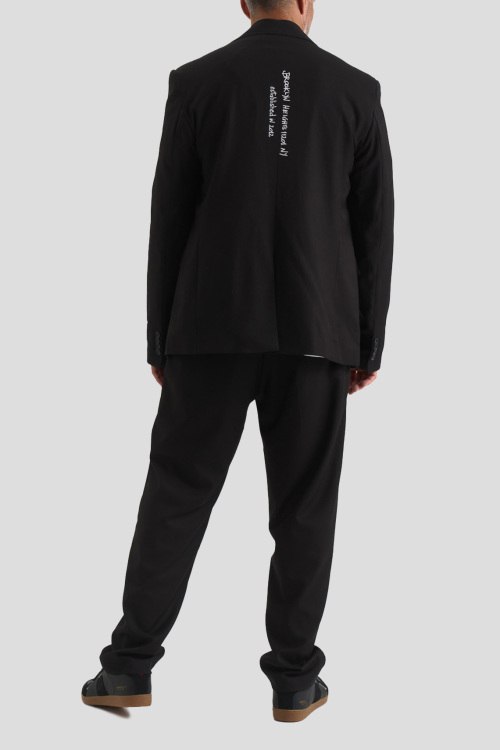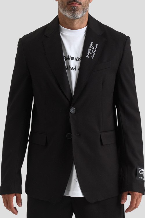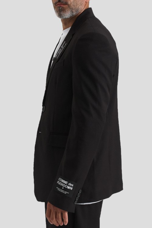 Детали: МУжской черный пиджак из полиэстера и вискозы от Comme des Fuckdown (Камм дес Факдаун). Отложной воротник, застежка на пуговицы, прорезыне карманы с клапаном, модель декорирована принтом на спине и на воротнике, патч-лого на рукаве