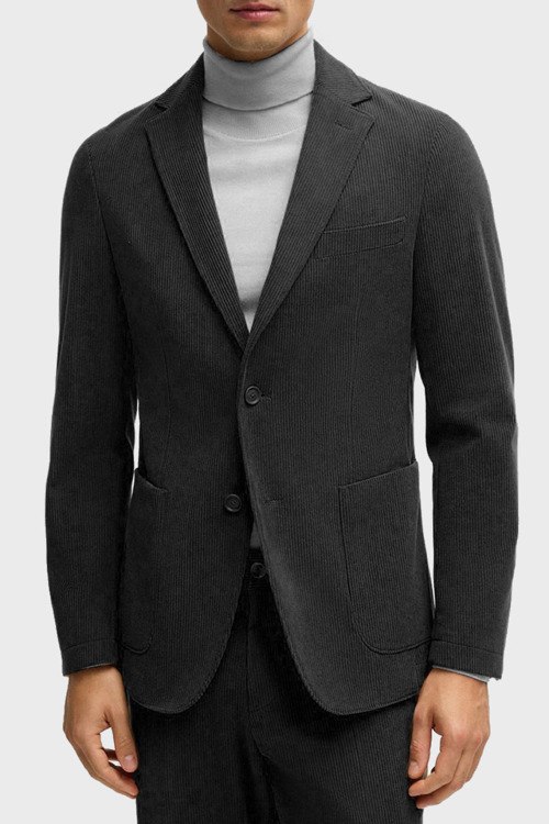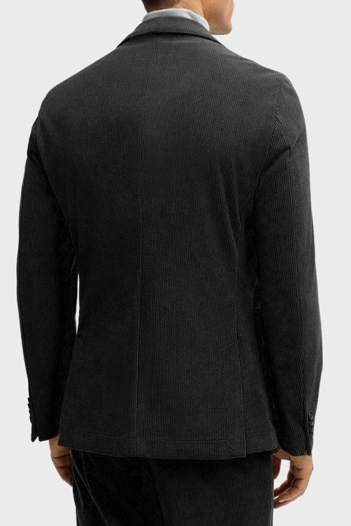 Мужской черный вельветовый пиджак Hanry из полиэстера от Hugo Boss (Хуго Босс). Отложной воротник, застежка на пуговицы, накладные карманы, фигурный низ изделия.