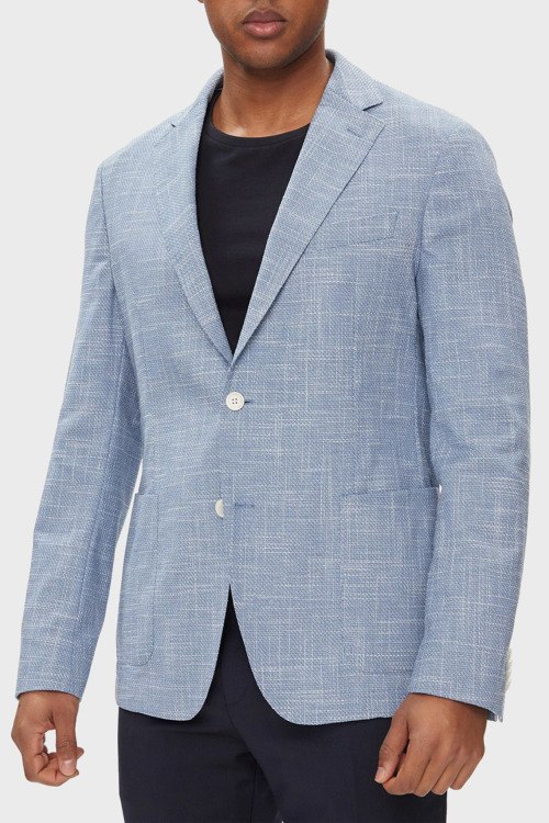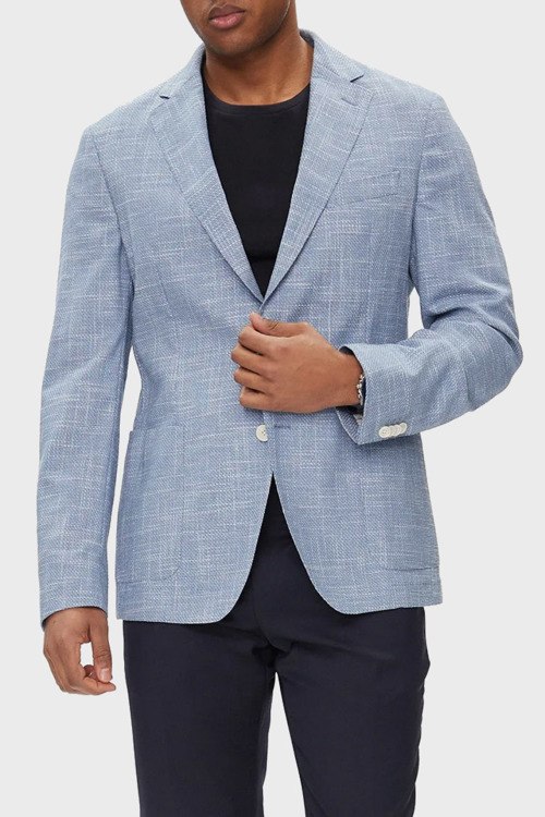 Детали: Мужской голубой пиджак из шерсти и льна от Hugo Boss (Хуго Босс). Отложной воротник, застежка на пуговицы, прорезные карманы с клапаном, нагрудный карман, манжеты на пуговицах