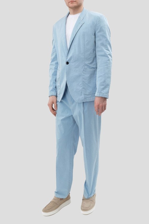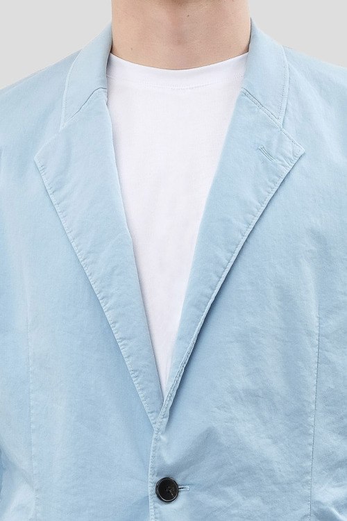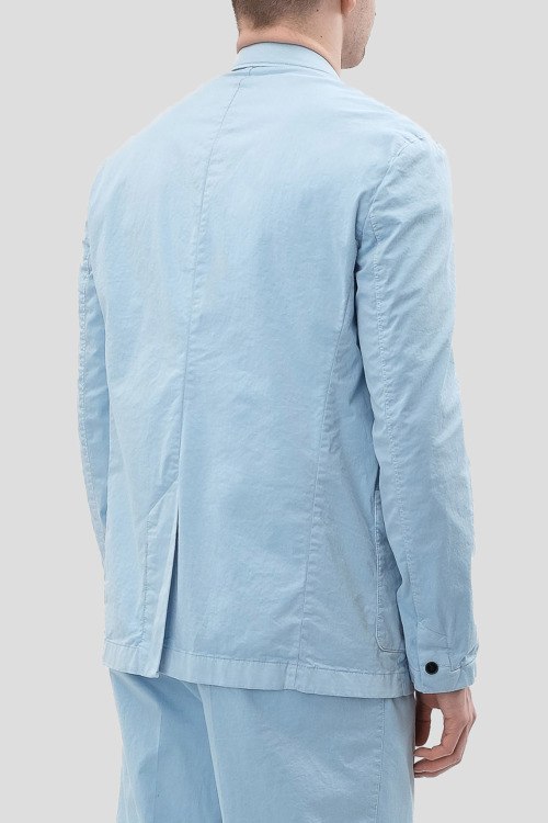 Детали: Мужской голубой хлопковый пиджак от Hugo by Hugo Boss (Хуго бай Хуго Босс). Отложной воротник, два накладных кармана, застежка на одну пуговицу, классическая длина