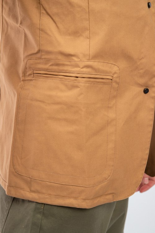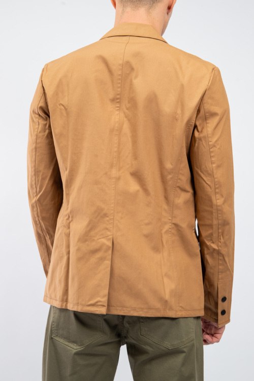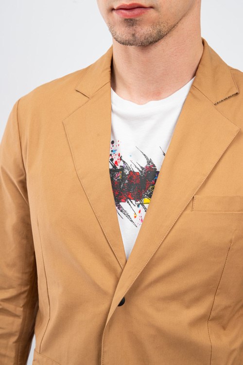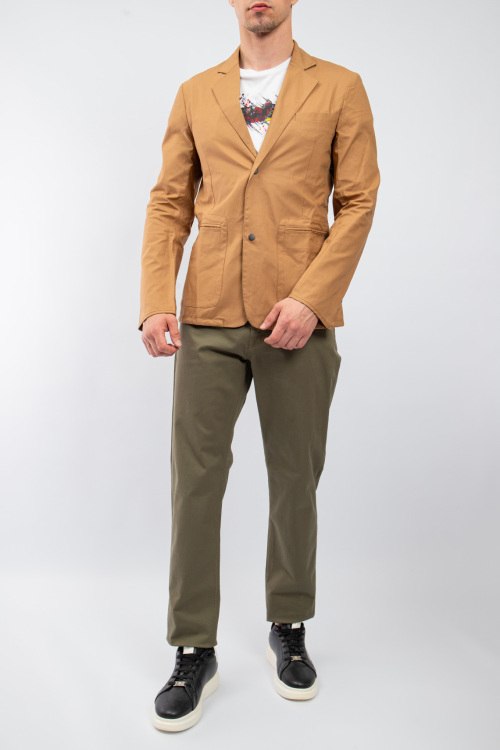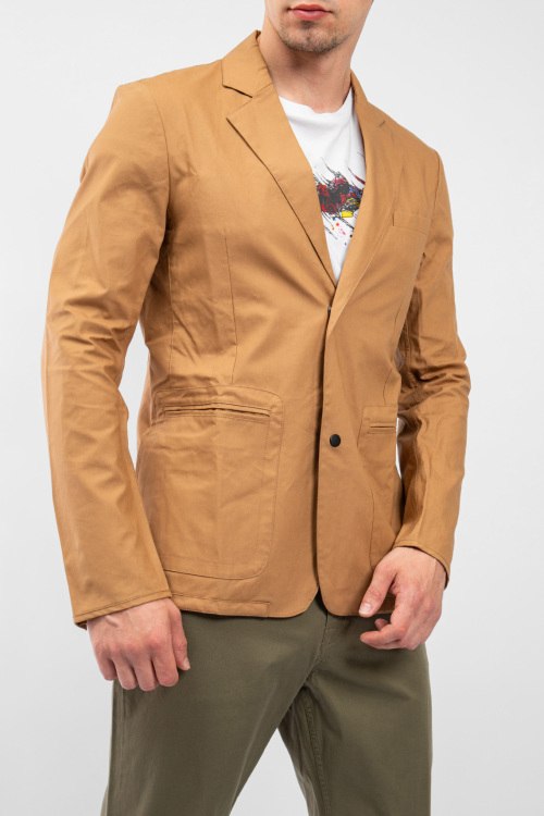 Детали: Мужской хлопковый пиджак цвета кэмел от Emporio Armani (Эмпорио Армани). Отложной воротник, три кармана, застежка на две кнопки, классическая длина