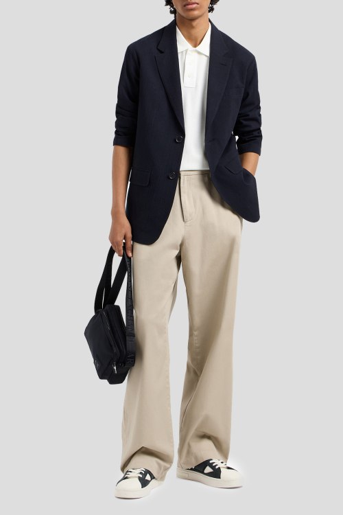 Детали: Мужской темно-синий хлопковый пиджак от Armani Exchange (Армани Эксчендж). Отложной воротник с заостренными лацканами, три кармана, застежка на две пуговицы, классическая длина