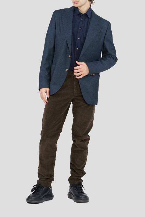 Детали: Мужской темно-синий пиджак из шерсти от Sand (Санд). Классическая длина, отложной воротник, застежка на пуговицы, накладные карманы, фигурный низ изделия