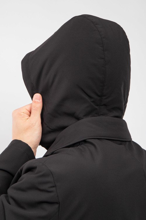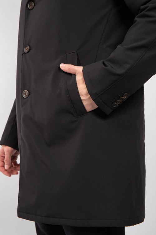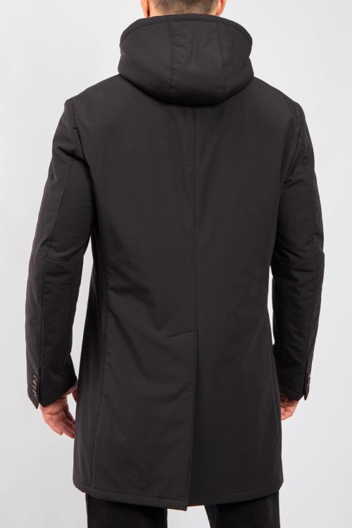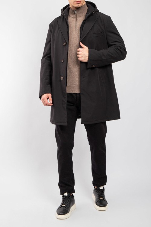 Детали: Мужской черный плащ от Corneliani (Корнелиани). Съемная вставка с капюшоном, отложной воротник, три кармана, застежка на три пуговицы, шерстяная подкладка, длина выше колен. Размер вещи на фото: 52