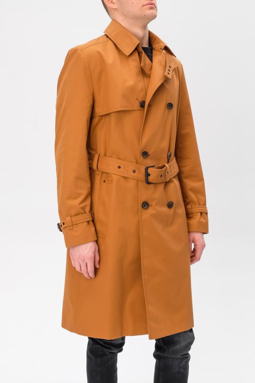 Мужской рыжий плащ из хлопкового микса от Hugo by Hugo Boss (Хуго бай Хуго Босс). Длина до колена, отложной воротник, двубортная модель, застежка на пуговицы, длинные рукава, пояс в тон изделия, распорка сзади