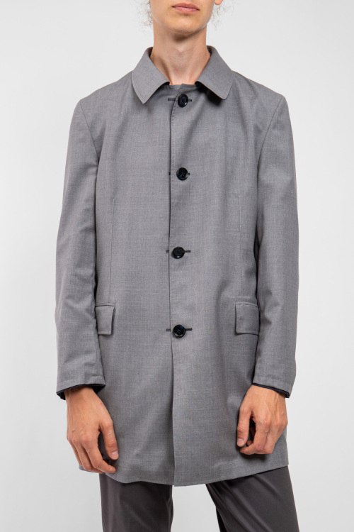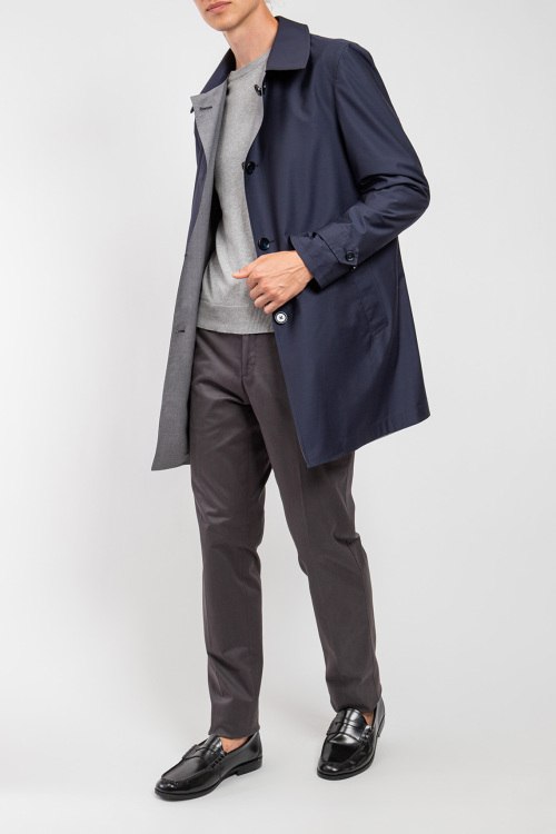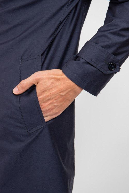 Мужской темно-синий шерстяной плащ от Scabal (Скабал). Двустороняя модель, отложной воротник, боковые карманы, застежка на пуговицы, длина выше колен. Параметры модели: рост 188, 91-70-92 см. Замеры для размера 50: длина изделия - 89 см; ширина по груди - 56 см; ширина по талии - 55 см; длина рукава по внутреннему шву - 44 см / от плеча - 65 см.