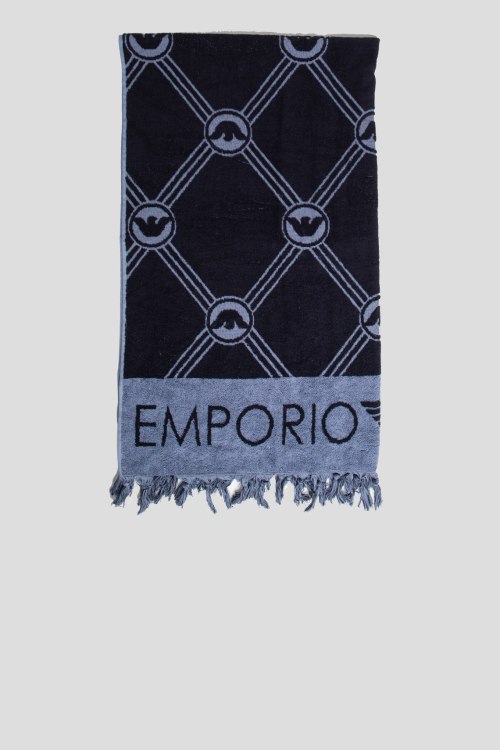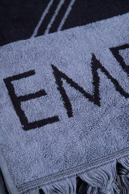 Детали: Мужское темно-синее пляжное полотенце из хлопка от EA7 Emporio Armani (ЕА7 Эмпорио Армани). Прямоугольная форма, бахрома по бокам, дизайн с брендированным принтом