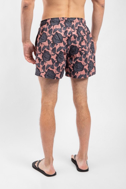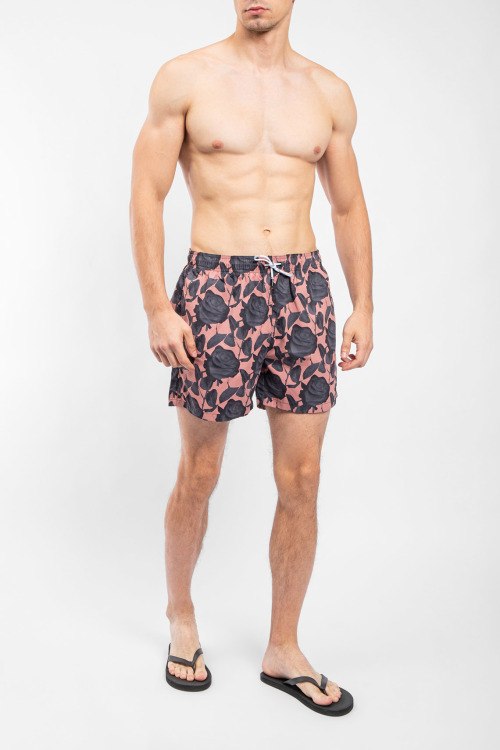 Мужские бежевые пляжные шорты от Hugo Boss (Хуго Босс). Цветочный принт, эластичный пояс на завязках, боковые карманы, короткая длина.