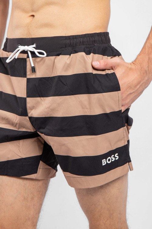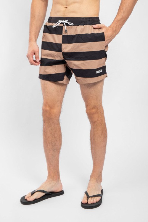 Мужские бежево-черные пляжные шорты от Hugo Boss (Хуго Босс). Принт в полоску, принт с логотипом, эластичный пояс на завязках, боковые карманы, короткая длина.