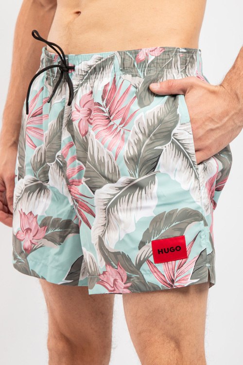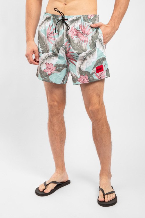 Мужские бирюзовые пляжные шорты от Hugo Boss (Хуго Босс). Принт по всей поверхности, эластичный пояс на завязках, боковые карманы, короткая длина.