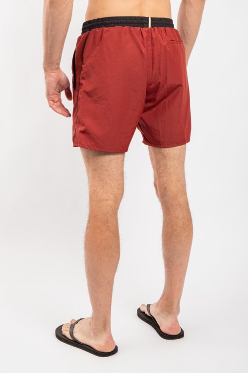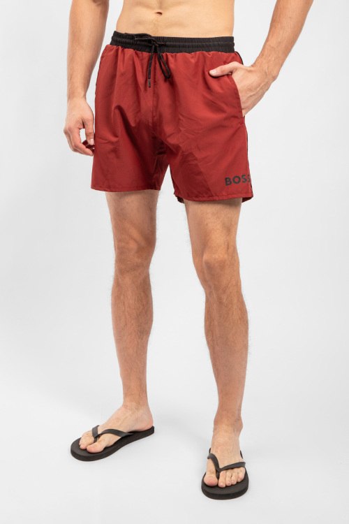 Мужские бордовые пляжные шорты от Hugo Boss (Хуго Босс). Принт логотипа, эластичный пояс на завязках, боковые карманы, длина выше колен.