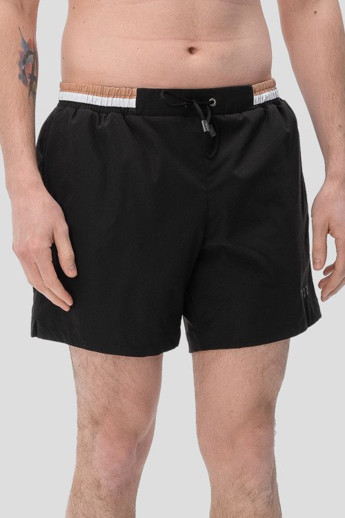 Детали: Мужские черные пляжные шорты Atoll от Hugo Boss (Хуго Босс). Эластичный пояс на завязках, боковые карманы, принт с логотипом, короткая длина