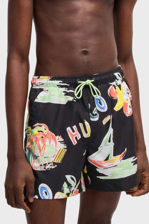 Детали: Мужские черные пляжные шорты Calala от Hugo by Hugo Boss (Хуго бай Хуго Босс). Принт по всей поверхности, эластичный пояс на завязках, боковые карманы, длина выше колен