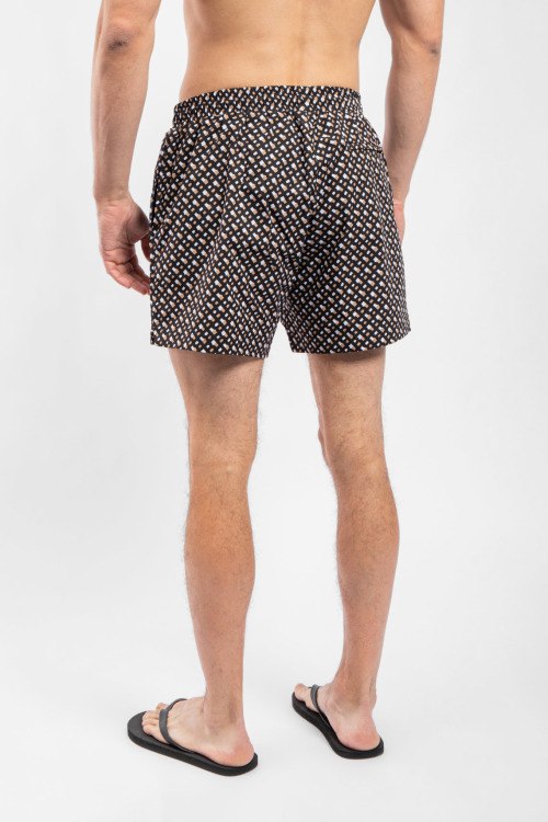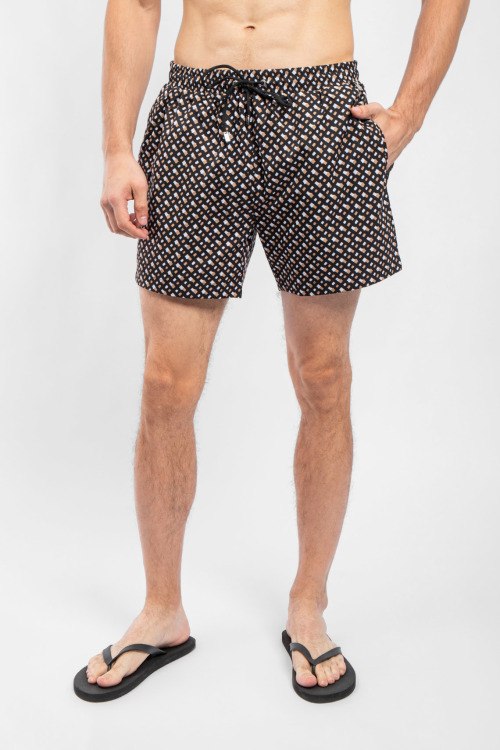 Мужские черно-коричневые пляжные шорты от Hugo Boss (Хуго Босс). Принт с монограммой по всей поверхности, эластичный пояс на завязках, боковые карманы, короткая длина.