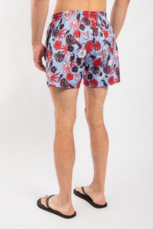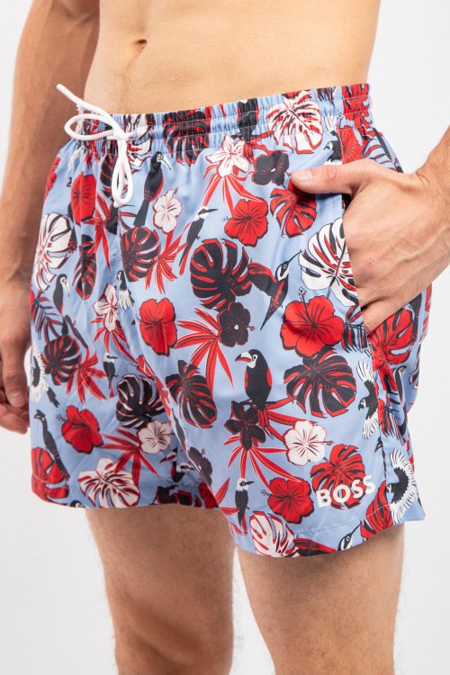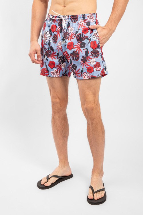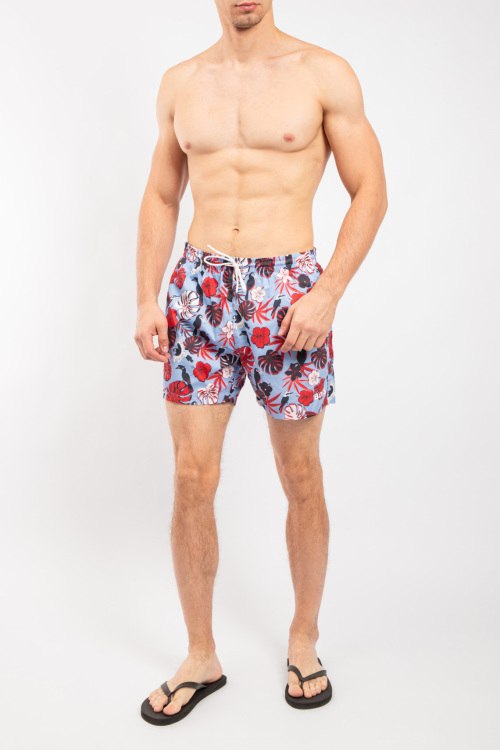 Мужские голубые пляжные шорты от Hugo Boss (Хуго Босс). Принт по всей поверхности, эластичный пояс на завязках, боковые карманы, короткая длина.