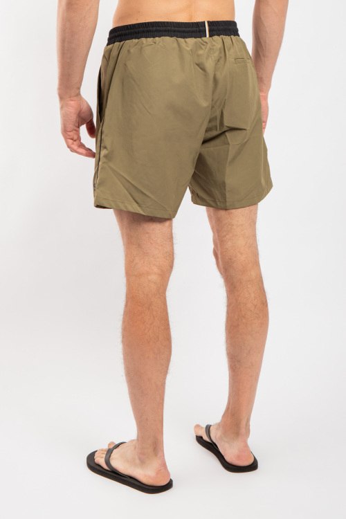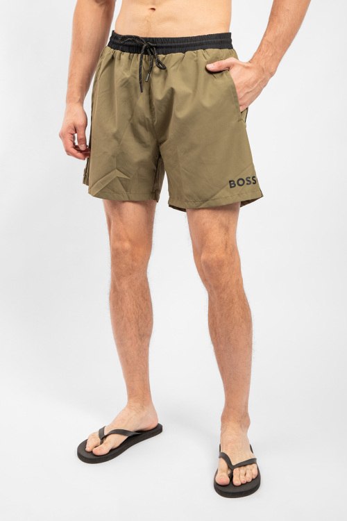 Мужские пляжные шорты цвета хаки от Hugo Boss (Хуго Босс). Принт логотипа, эластичный пояс на завязках, боковые карманы, длина выше колен.