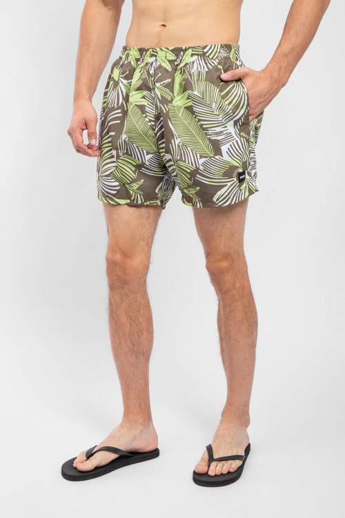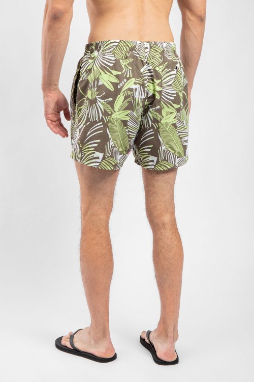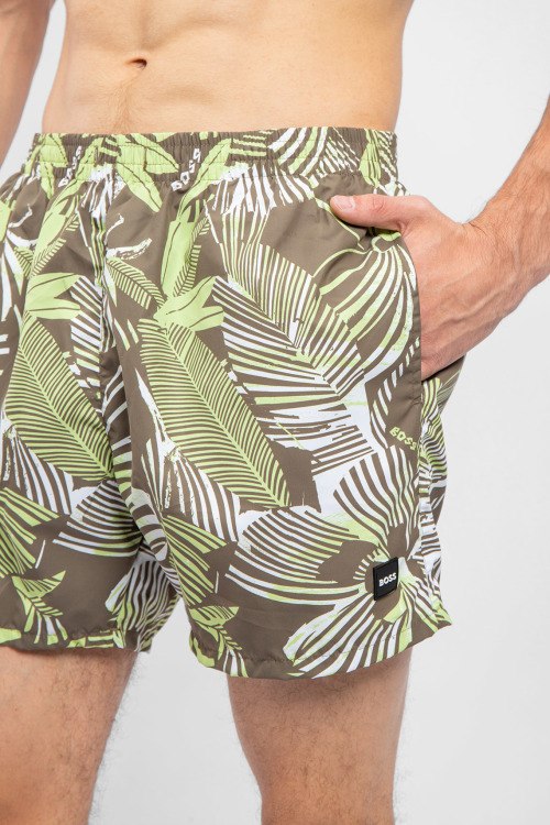Мужские пляжные шорты цвета хаки от Hugo Boss (Хуго Босс). Принт по всей поверхности, нашивка с логотипом, эластичный пояс, боковые карманы, короткая длина.