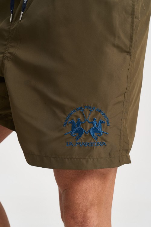 Детали: Мужские пляжные шорты цвета хаки от La Martina (Ла Мартина). Эластичный пояс на завязках, боковые карманы, вышитый логотип, длина выше колен. Параметры модели: 112см - 82см - 93см. Рост - 180 см. Размер на фото - M