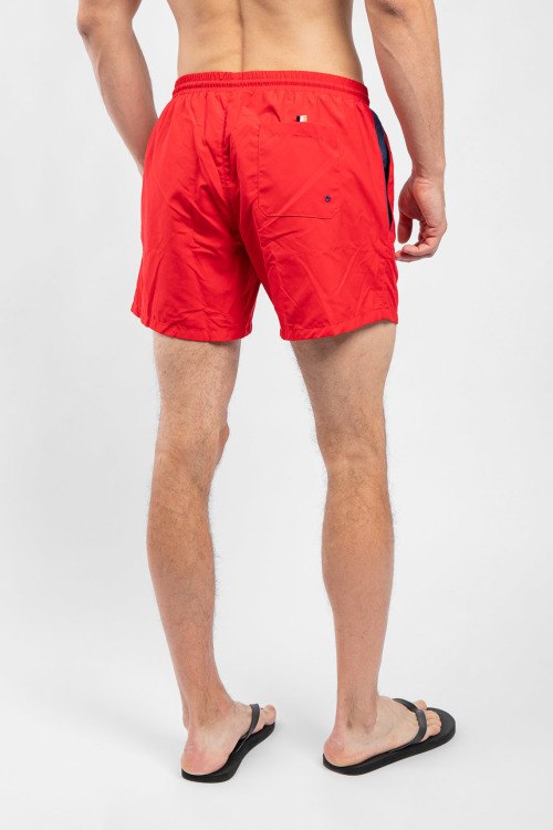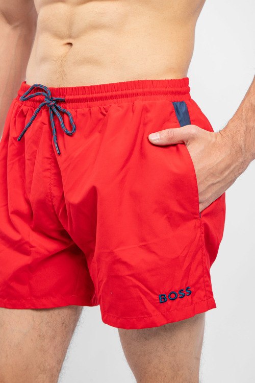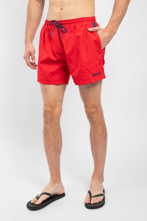Мужские красные пляжные шорты от Hugo Boss (Хуго Босс). Вышитый логотип, эластичный пояс на завязках, боковые карманы, короткая длина.
