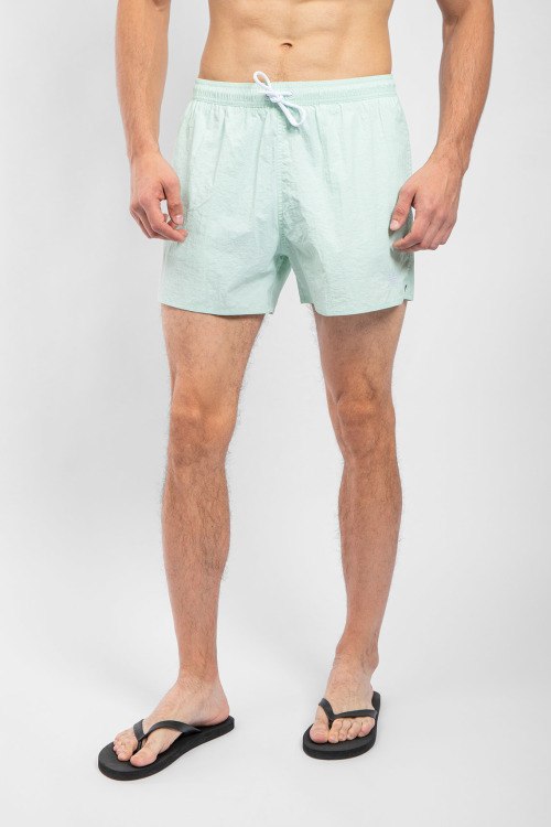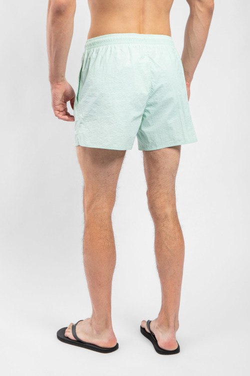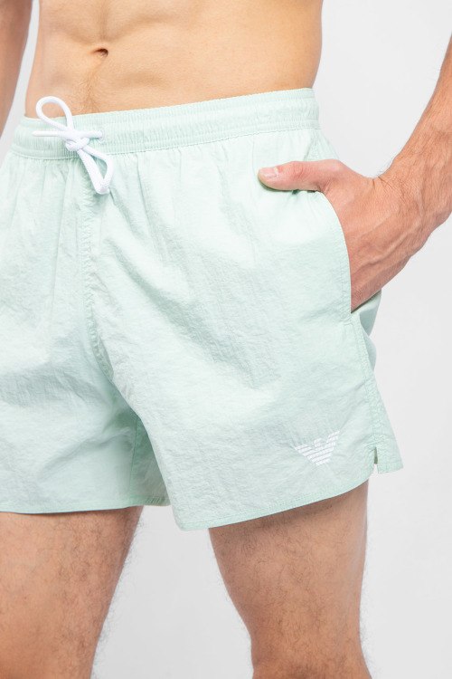 Мужские мятные пляжные шорты от Emporio Armani (Эмпорио Армани). Вышитый логотип, эластичный пояс на завязках, боковые карманы, короткая длина.