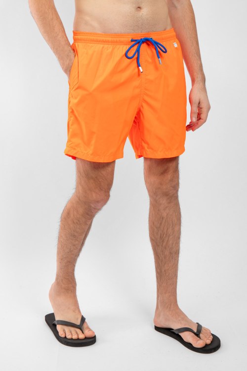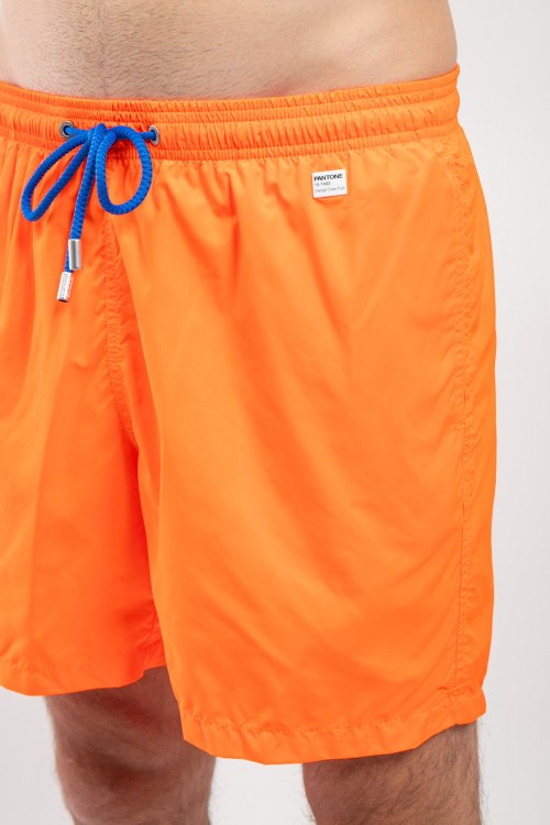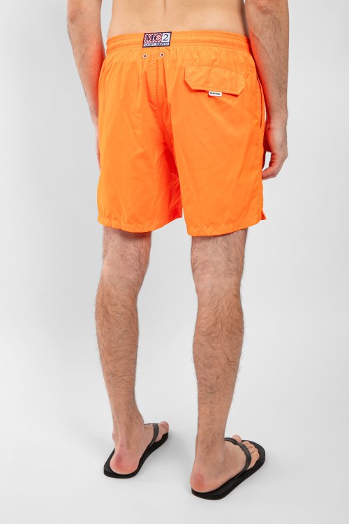 Детали: Мужские оранжевые пляжные шорты Pantone™ Special Edition от Mc2 Saint Barth (Mc2 Сент Барт). Эластичный пояс на завязках, боковые карманы, нашивка с логотипом сзади на поясе