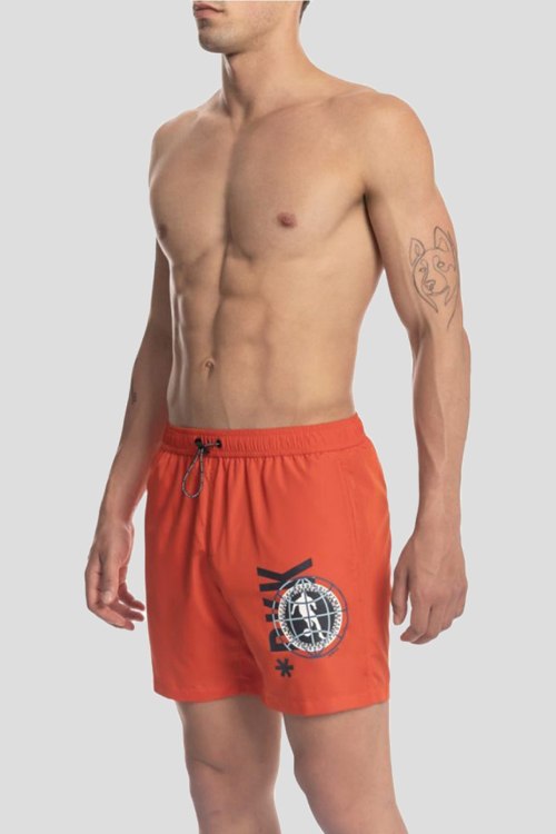 Детали: Мужские оранжевые пляжные шорты из полиамида от Dirk Bikkembergs (Дирк Биккембергс). Средняя длина, эластичная резинка на поясе с кулиской, накладной задний карман, спереди принт с логотипом бренда