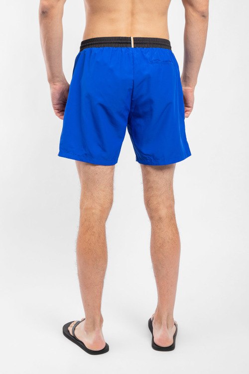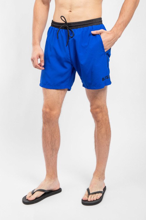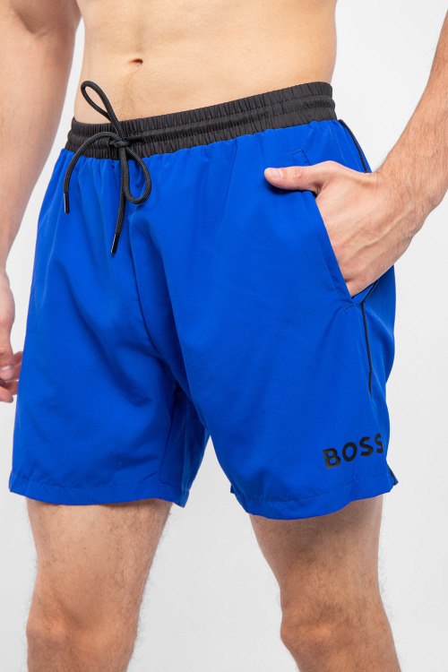 Мужские синие пляжные шорты от Hugo Boss (Хуго Босс). Принт логотипа, эластичный пояс на завязках, боковые карманы, короткая длина.