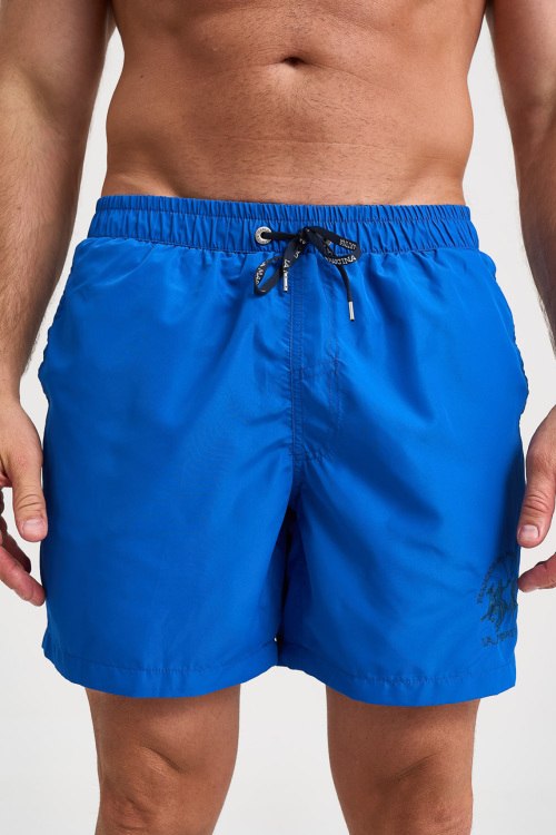 Детали: Мужские синие пляжные шорты от La Martina (Ла Мартина). Эластичный пояс на завязках, боковые карманы, вышитый логотип, длина выше колен. Параметры модели: 112см - 82см - 93см. Рост - 180 см. Размер на фото - M