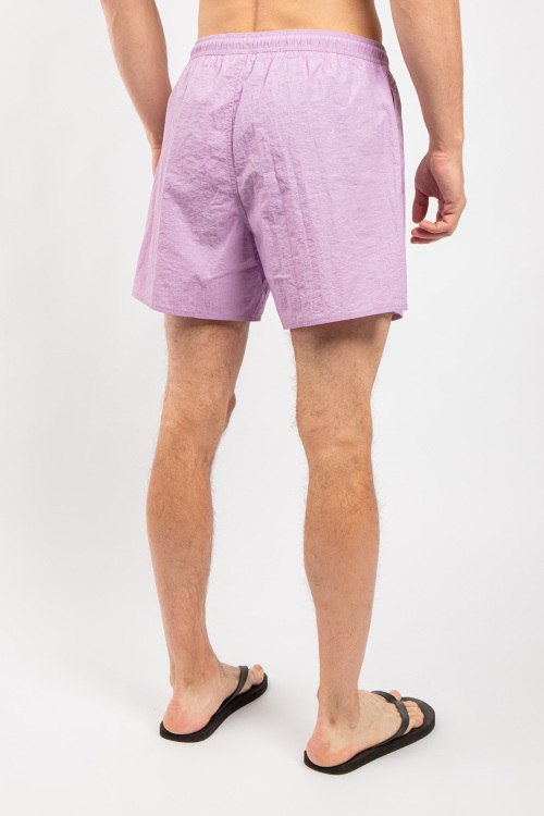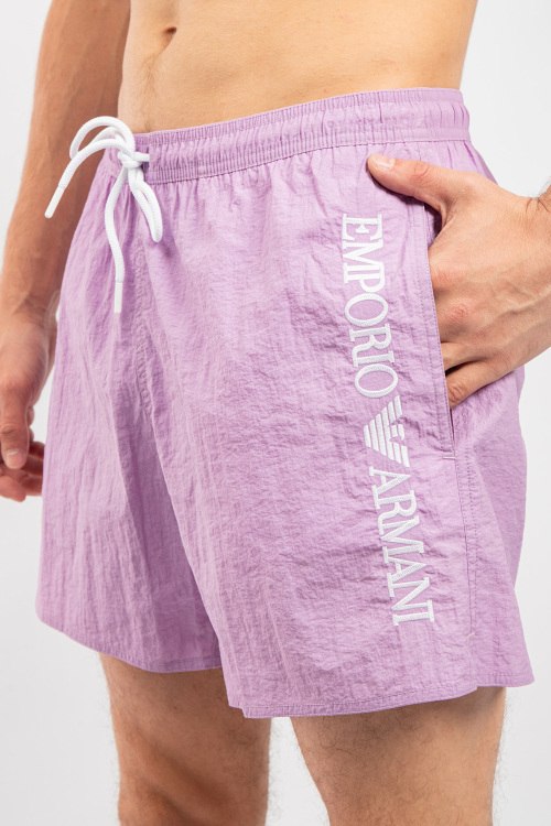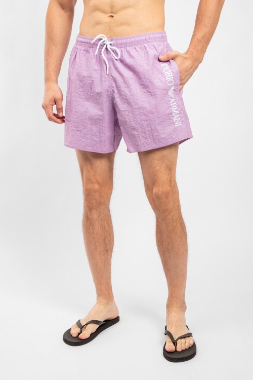 Мужские сиреневые пляжные шорты от Emporio Armani (Эмпорио Армани). Вышитый логотип, эластичный пояс на завязках, боковые карманы, короткая длина.