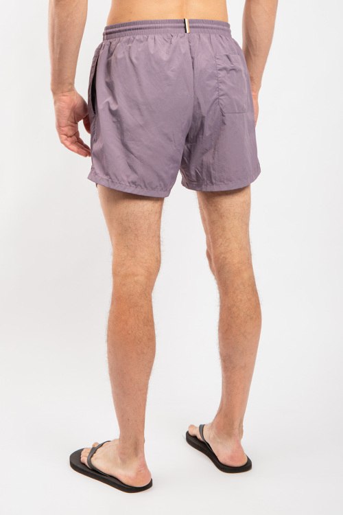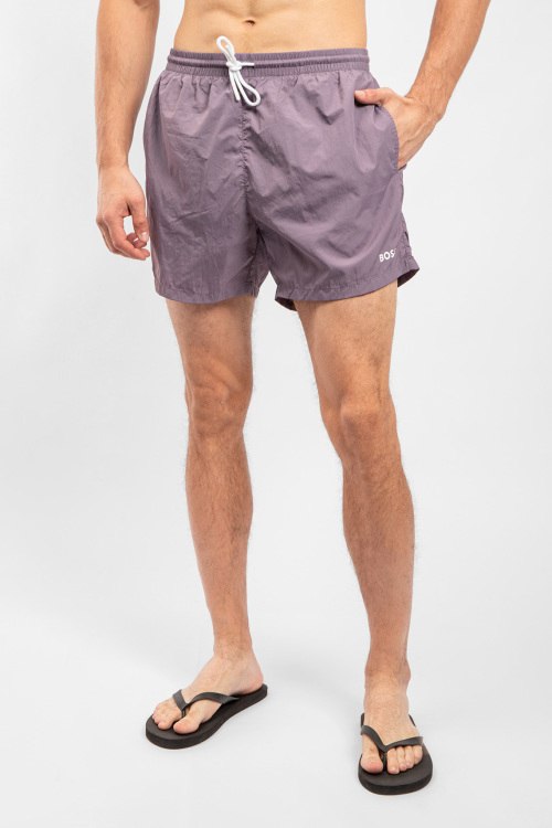 Мужские темно-сиреневые пляжные шорты от Hugo Boss (Хуго Босс). Принт логотипа, эластичный пояс на завязках, боковые карманы, короткая длина.