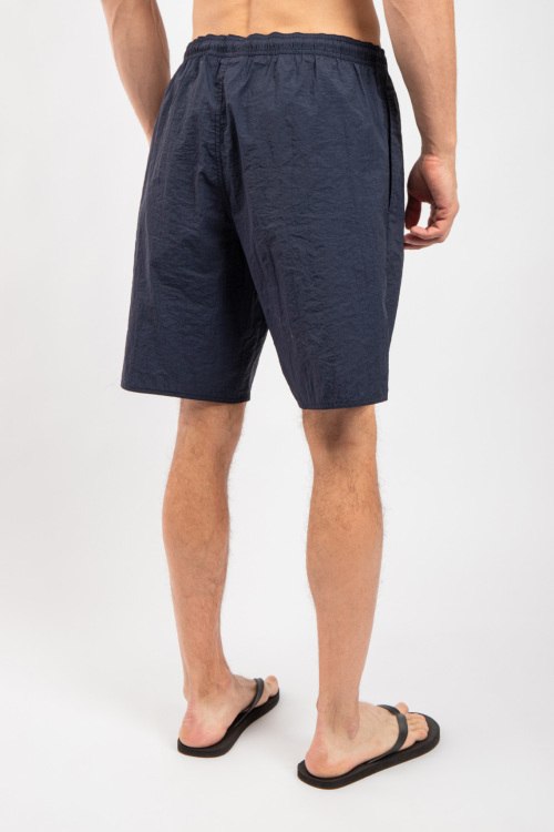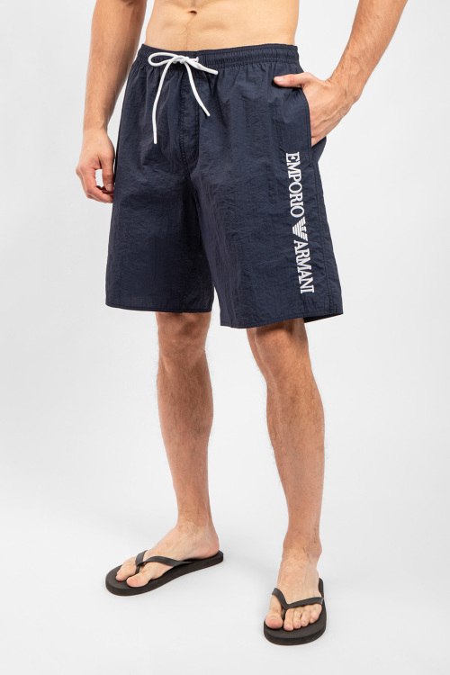 Мужские темно-синие пляжные шорты от Emporio Armani (Эмпорио Армани). Вышитый логотип, эластичный пояс на завязках, боковые карманы, длина до колен.