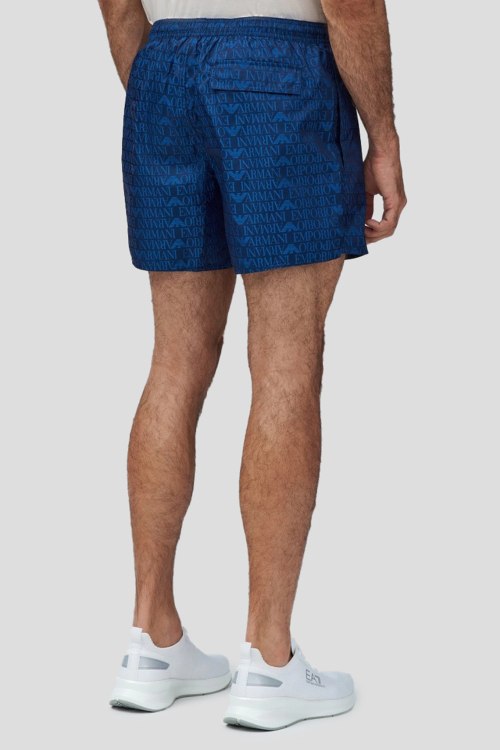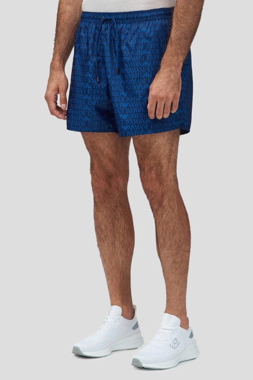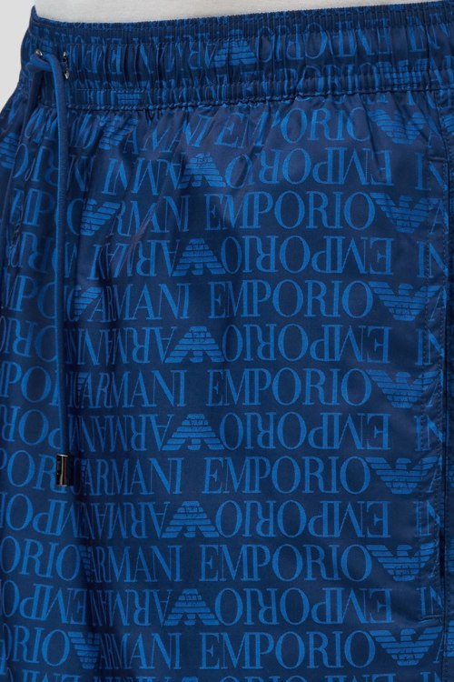 Детали: Мужские темно-синие пляжные шорты от Emporio Armani (Эмпорио Армани). Логотип по всей поверхности, эластичный пояс на завязках, боковые карманы, короткая длина
