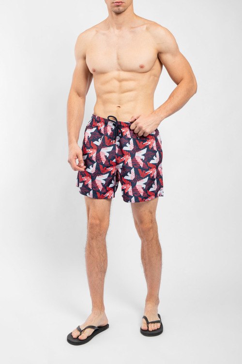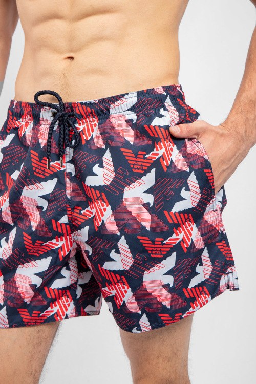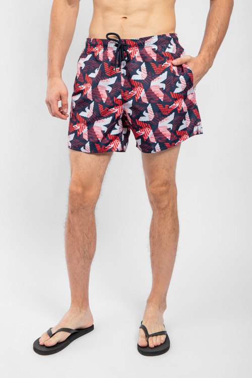 Мужские темно-синие пляжные шорты от Emporio Armani (Эмпорио Армани). Принт с логотипом по всей поверхности, эластичный пояс на завязках, боковые карманы, короткая длина.