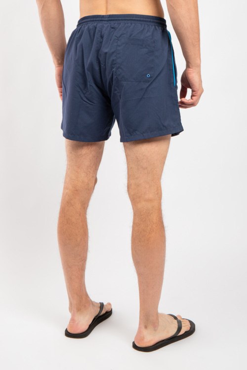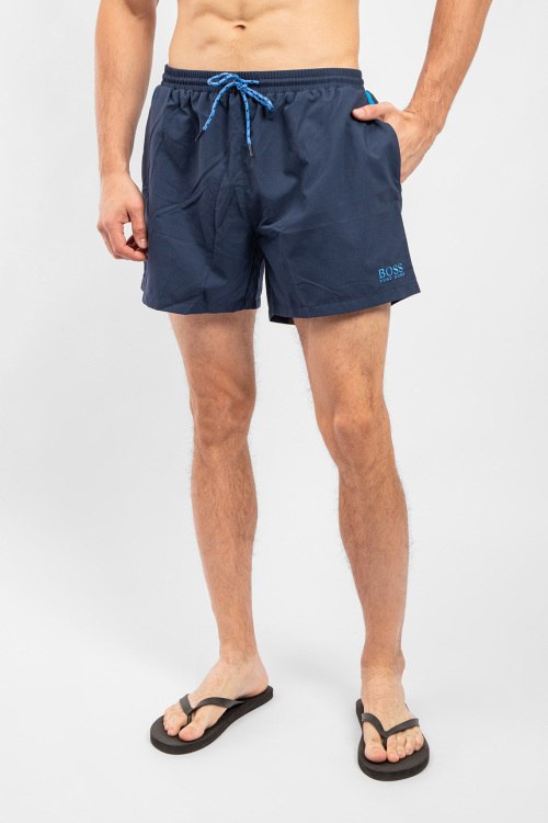 Мужские темно-синие пляжные шорты от Hugo Boss (Хуго Босс). Вышитый логотип, эластичный пояс на завязках, боковые карманы, короткая длина.