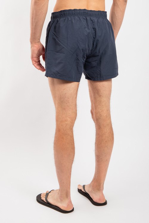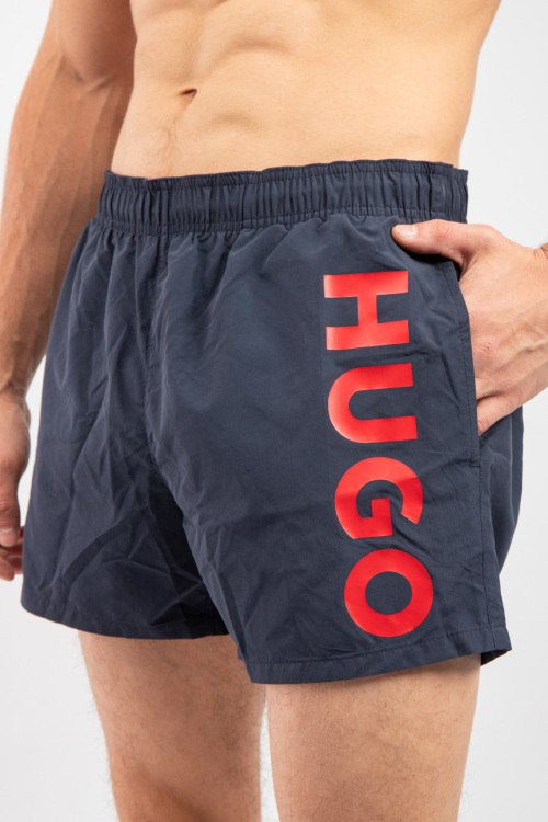 Мужские темно-синие пляжные шорты от Hugo Boss (Хуго Босс). Принт с логотипом, эластичный пояс, боковые карманы, короткая длина.